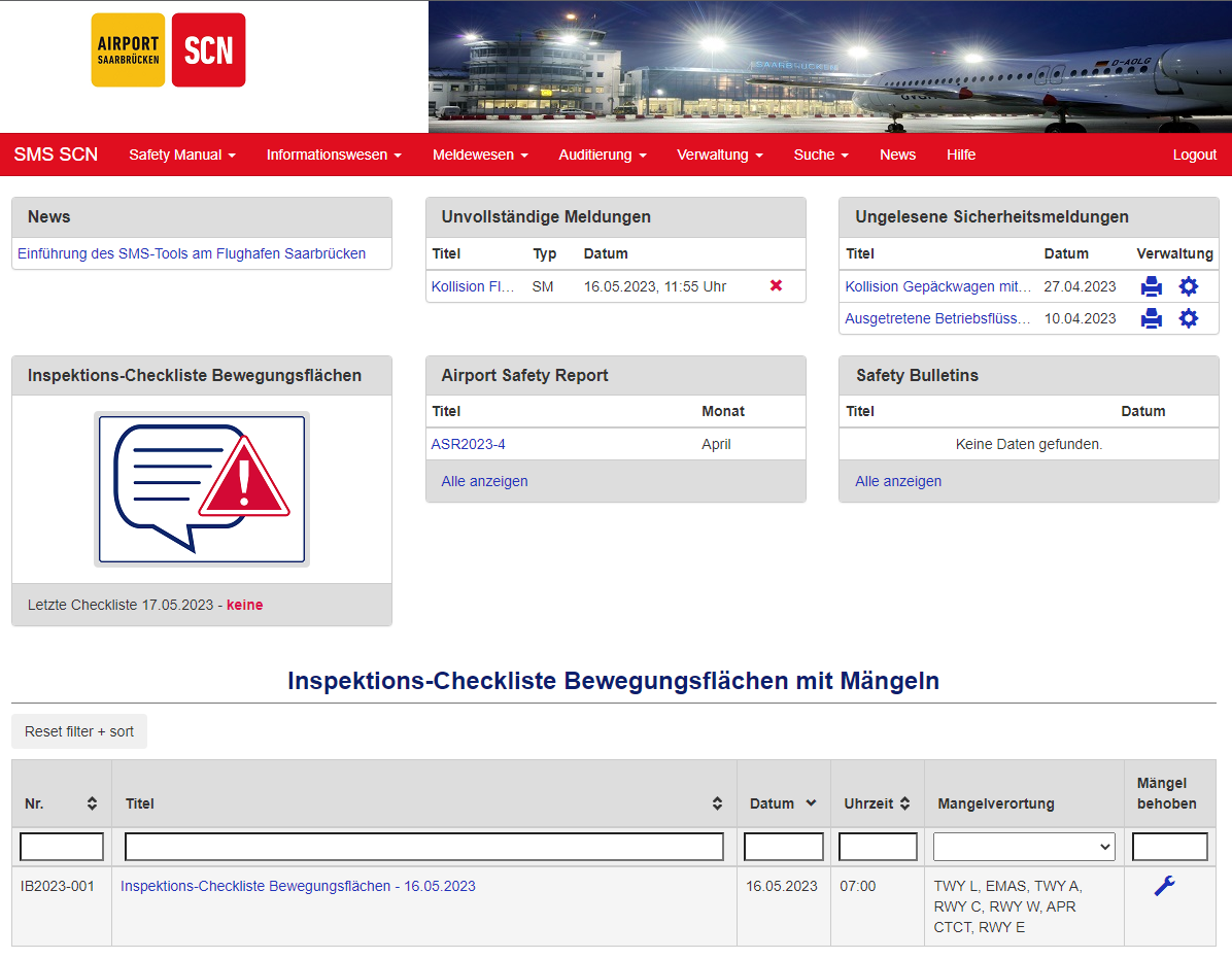 Saarbrücken Airport (SCN) has opted for GfL's Safety Management System. The system has now been configured to the airport's requirements and is in productive use. The following modules and reports are integrated at SCN and can now be submitted and managed digitally:
